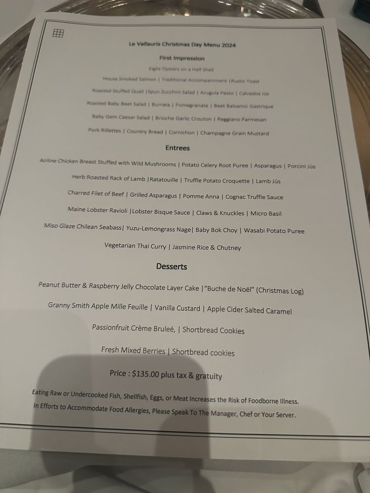 “ My mother and I just came back from having Christmas dinner at Le Vallauris. I was a bit scared of spending our evening here given the recent, questionable reviews but we had a great time. Service started off a bit poor with us being seated and given water, but then we didn't see anyone for about 15 minutes or so after that. Once we placed our orders, everything was perfection. The food was outstanding, despite not knowing that is was a set menu at $135/pp. Oysters were a tad small, but my mom loved her beet and burrata salad. Her filet and my sea bass were awesome. Desserts were equally as tasty; PB&J log and Passionfruit Creme Brûlée. The restaurant was cozy inside, but my chair had the fabric torn which wasn't the best look for such a nice place. Overall, I would come back here for a special occasion. ”
